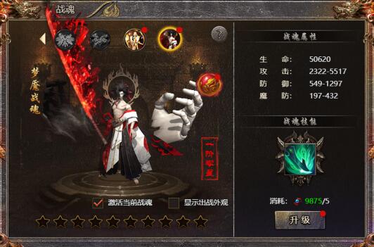 3、激活战魂可获得大量属性以及强力buff:攻击时有概率释放“断魂斩”,对当前目标施加1.5秒的“断魂”效果:断魂状态下,目标及其分身无法释放任意技能且无法移动,同时受到的一切伤害提升15%,激活后永久生效