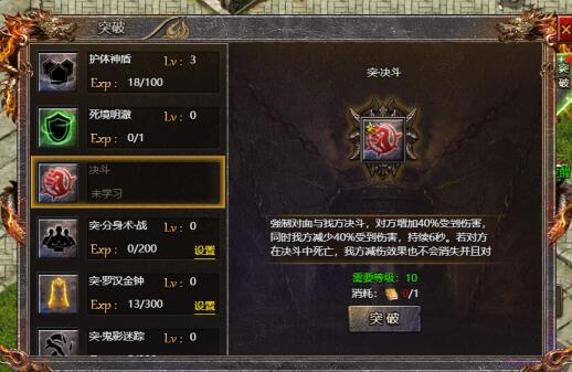 4、技能突破后,每级决斗的增减伤效果额外增加30%,决斗持续时间额外增加3秒,对方决斗期间阵亡我方减伤效果也不会消失,并且对方行会所有成员一段时间内无法通过召唤令传送。