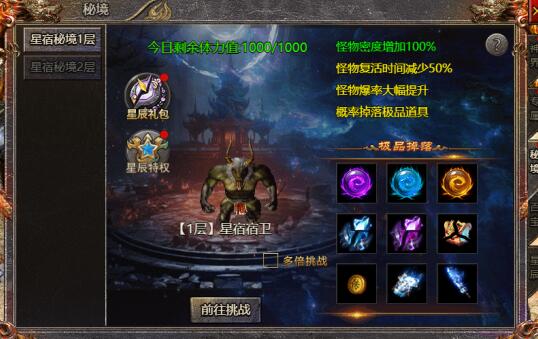 3、秘境怪物死亡会掉落魂骨和星辰玩法相关道具,挑战更高层数副本极品道具掉率增加。