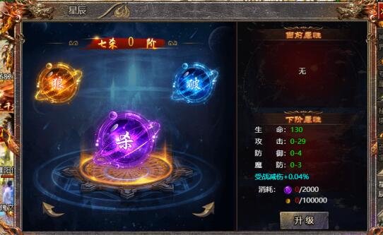 1、消耗精魄可以升级星辰系统,升级后会获得大量属性;