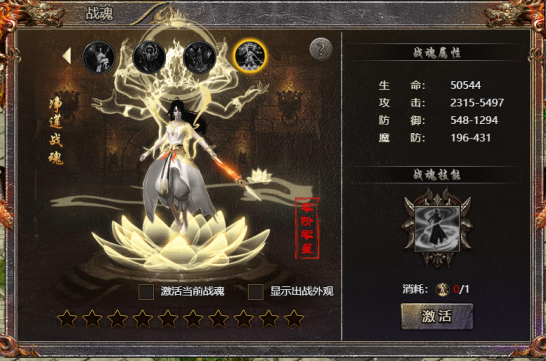 3、激活战魂可获得大量属性以及强力buff:受到玩家攻击时概率触发,免疫该次伤害并将伤害的60%反弹给周围随机敌对1个玩家,多次反伤时有概率对单个玩家造成多次伤害,激活后永久生效