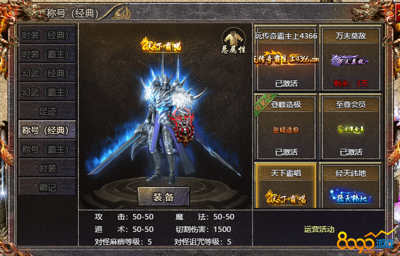 传奇霸主经典称号:万夫莫敌、登峰造极、至尊会员、天下霸唱、经天纬地;