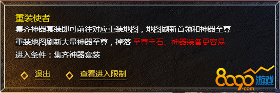 集齐神器套装,即可前往对应重装地图,地图刷新首领和神器至尊重装地图刷新大量神器至尊,掉落至尊宝石、神器装备更容易。