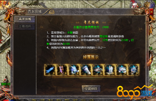 搜索"8090网页游戏"在传奇霸主这款游戏中有很多很多的地图,其中就包括这青龙领域,那么青龙领域该如何进入呢?进入条件又是什么呢?今天就带各位玩家来看看吧!