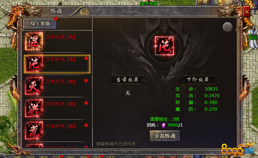 搜索"8090网页游戏"在传奇霸主,万字诀是一套较难获得的装备,这种装备除了能通过升级,来提升装备实力外,还能通过炼魂功能,加强这类装备的属性效果的。本期就带各位玩家了解一下。