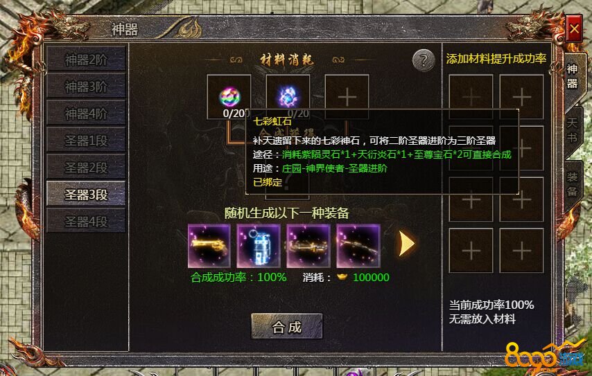 玩家要想使用七彩虹石,可前往庄园的NPC“神界使者”处对话,可以找到圣器3段的界面,就能消耗任意4星圣器、200个七彩虹石、20个雷渊圣石、10万元宝,随机合成任意1件5星圣器。合成成功几率为百分百成功的,玩家佩戴上高阶圣器,可以获得更强的属性和额外的圣器效果,让你的对手更易臣服于你哟!