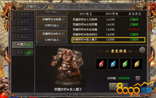 在游戏中,恶魔祭坛分为很多层,当玩家达到一定的转生等级之后,就可以选择层数进入了,恶魔祭坛总共有5层,分别需要达到2转、6转、8转、10转、12转,才可以进入,每位玩家都会拥有100点的封印值,当玩家获得BOSS归属之后,就会扣除封印值,在凌晨的时候封印值就会全部恢复,若玩家没有封印值的话,就没有办法获得BOSS归属权,击败BOSS之后也不会获得奖励,当玩家进入恶魔祭坛之后,有帮会的玩家就可以点击协助键,这样就可以像帮会中的成员发出求救了,当然没有封印值的玩家无法请求协助。