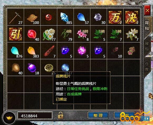 传奇霸主盾牌残片是一种棕黄色的饼状道具,在游戏中用于合成各种级别的盾牌装备,从而增强角色的战斗力。