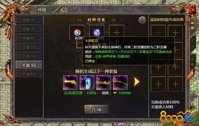 合成三阶圣器: 前往庄园内的NPC“神界使者”,与其对话并进入圣器3段的界面。玩家需消耗任意4星圣器、200个七彩虹石、20个雷渊圣石和10万元宝,以随机方式合成任意一件5星圣器。合成成功率为100%。升级后的圣器拥有更强大的属性和额外的效果,有助于提升角色的能力和战斗力。