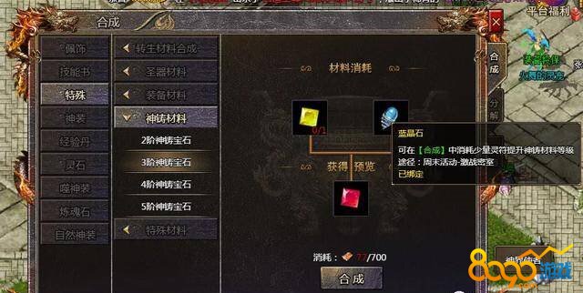 合成神铸宝石: 在神铸材料的合成界面中,通过消耗前一阶段的神铸宝石、一定数量的蓝晶石以及相应的灵符,进行神铸宝石的合成。