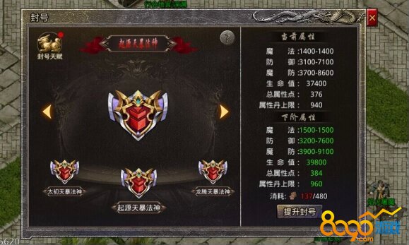 这只是其中一个职业(法师)的封号升级数据,不同职业可能有不同的封号名称和消耗数据。玩家提升封号后将获得生命、攻击/魔法/道术、防御、魔防的属性加成,同时可以获得天赋点和特殊称谓。