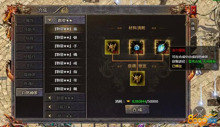合成自然神装: 为了使用自然精魄,玩家需要进入合成界面,找到自然神装的合成界面。在这里,玩家可以使用自然精魄来合成自然神装。不同星级的自然神装合成所需的自然精魄数量可能是不同的,这可能取决于自然神装的品质和效果。