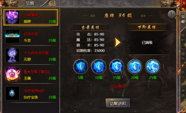 首先,要想提升切割属性,你需要通过“熔炉-觉醒”功能来觉醒你的盾牌、斗笠、元婴、玉佩、治疗宝珠这五件佩饰。随着觉醒等级的提高,你的切割属性也会相应增加。觉醒等级越高,切割属性就越高。当然,觉醒等级进阶需要消耗大量的觉醒之石、圣龙之魂、绑定元宝等材料。