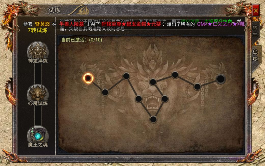 神龙淬炼是转生试炼的第一步,也是最具挑战性的一个环节。在这一步骤中,玩家需要消耗转生材料来点亮节点。随着转生阶数的提升,所需的转生材料也会越来越难以获取。