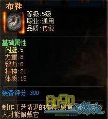 等级5级,职业通用,品质传说。布鞋基础属性:闪避:5,力量:8,智力:6,精神:21,体质:15,装备评分为300.