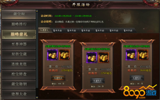 规则:开服7天内,每天可通过巅峰豪礼购买打折材料,每天都有不同豪礼。