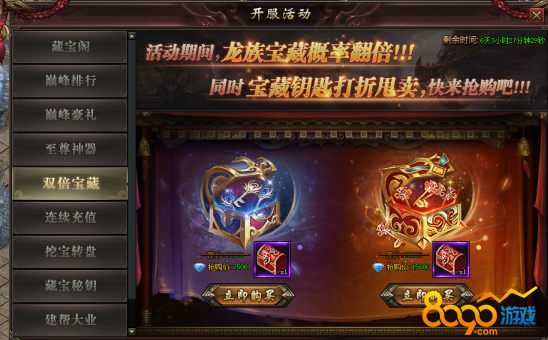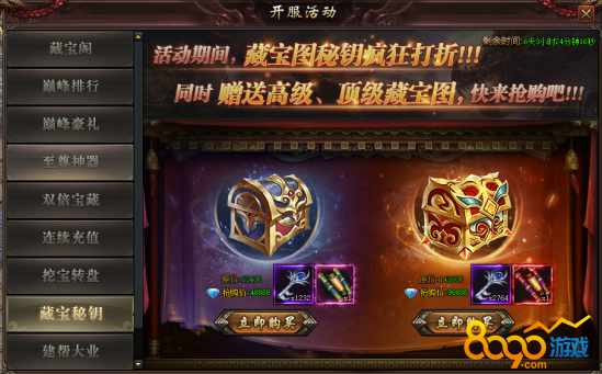 规则:开服7天内,可购买海量优惠藏宝秘钥,稀有珍品都在里头,不容错过!