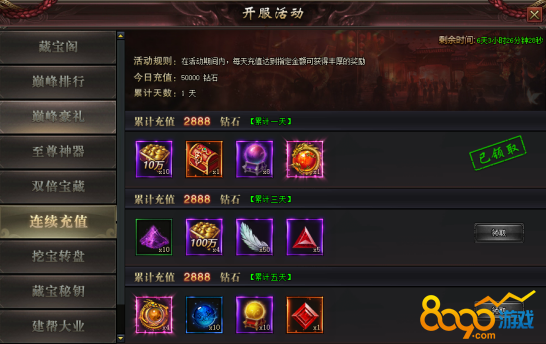 规则:开服7天内,累计充值达到一定充值天数,还可额外领取大礼一份。