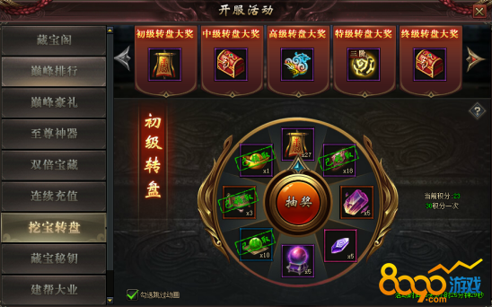规则:开服7天内,挖宝可获得挖宝积分,消耗挖宝积分可参与挖宝转盘活动,抽取极品大奖,抽的越多,奖励越珍贵!
