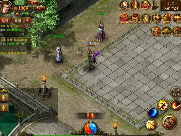 小技巧:接取任务不需要 挂机,点击【任务】会自动去打怪,任务完成后手动领取即可(挂机会自动完成任务,以免费领取的奖励完成,所以不建议);12个任务全部都用3倍奖励领取,绑金不足的可以丰富在线时间,以领取宝箱活动绑金,也可以在商城购买金砖,还可以通过打矿洞来获得绑金