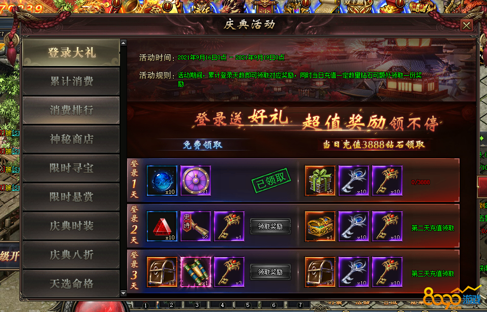 首先点开游戏主页面左边的庆典活动,打开活动界面。首先看到的是登录大礼,官方真是太给力,中秋佳节上来就送福利。活动时间是2021年9月16日0点到2021年9月19日0点。活动规则是累积登录天数即可领取对应奖励,同时当日充值一定数量钻石可额外领取一次奖励。只要当日充值3888钻石即可领取。第二个活动是累计消费领好礼,一共有4个档次,1888、5888、10888、19999钻石,充的越多,奖励越丰厚。然后石消费排行,根据玩家累计消费钻石进行排名,每个名次有最低标准,排行榜每次会在活动结束前进行封榜,封榜后消费不计入,奖励会在活动后邮箱发送。还有神秘商店活动,活动期间,神秘商店中会出现各种打折商品,商店物品每2小时或全部购买后立即刷新,每种道具限购一次。