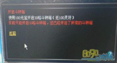 使用100元宝开启30格斗转箱(返还100灵符),目前只能开启30格斗转箱,您已经开启了所有的斗转箱。