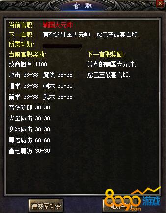 传奇归来辅国大元帅有什么奖励?辅国大元帅加成是什么?下面我们来看看这最高官职的属性吧。