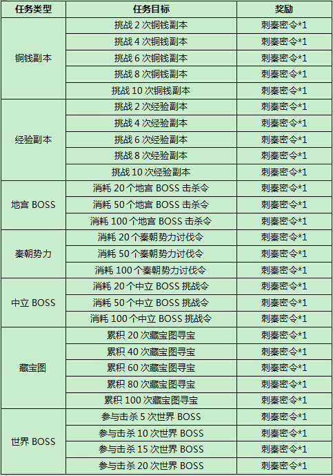 【活动内容】活动期间,完成指定系统目标任务,即可奖励刺秦密令