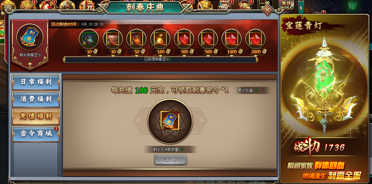 每充值100元:宝刺秦密令*1