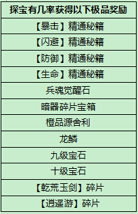 2. 探宝分为“探宝一次”和“探宝十次”两种参与方式,“探宝十次”必得极品奖励!