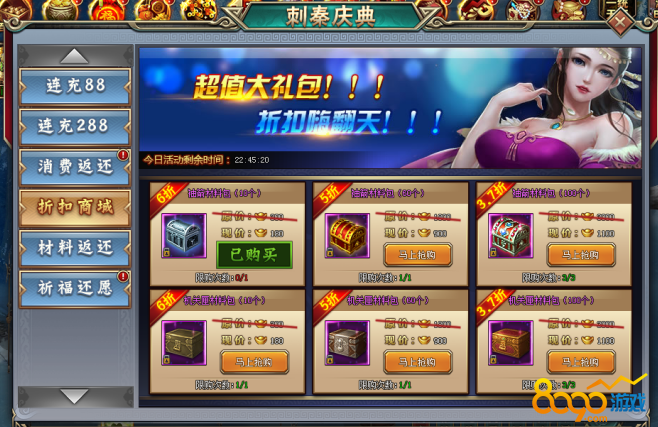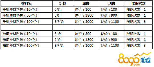 【活动内容】活动期间,玩家可花费元宝购买袖箭材料包和机关匣材料包,超低折数,绝对超值!