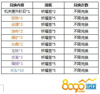 【活动内容】活动期间,可消耗指定数量的祈福签兑换机关匣升阶石,神兵材料等丰厚豪礼,祈福签可通过天官祈福活动获得。
