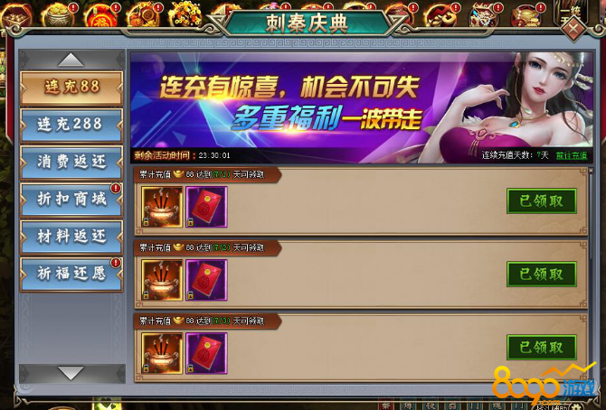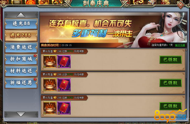 【活动内容】活动期间,玩家连续充值88元宝达到指定天数,即可领取丰厚豪礼