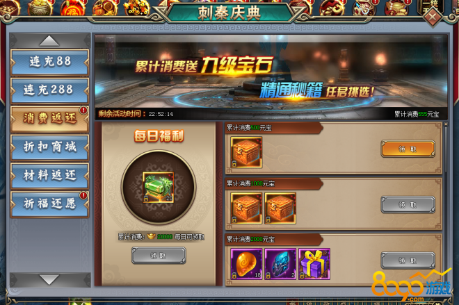 2. 累计消费达到20000元宝的玩家,每日还可领取额外奖励,越早消费越早领取哦~