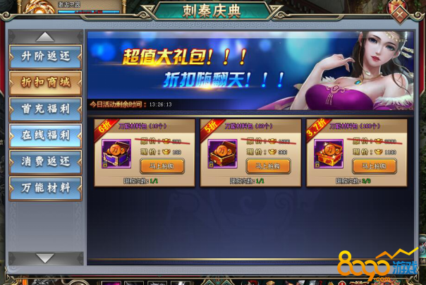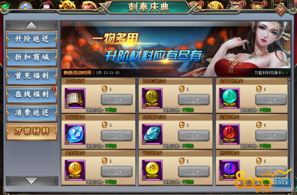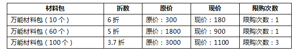 1. 活动期间,玩家可花费元宝购买万能材料包,超低折数,绝对超值!
