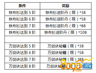 1. 活动期间铁布衫升级至指定阶数,即可领取海量铁布衫进阶丹和万剑诀秘籍奖励