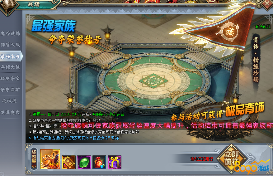 刺秦秘史中的家族是游戏中的一大特色与创新,其中也衍生出了其他的一些玩法。其中,最强家族的活动是最有代表性的。
