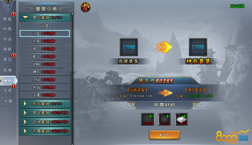 神兵套装分为5个档次,只有把上一层的神兵激活,才能激活下一层的神兵,神兵为玩家增加了大量的属性,从第一套的勇士套装的提升10%,到第五套的天尊套装的50%,而集齐全部的一套的神兵套装还可以增加神兵的套装效果,全身集齐3、6、10件神兵激活套装属性加成。