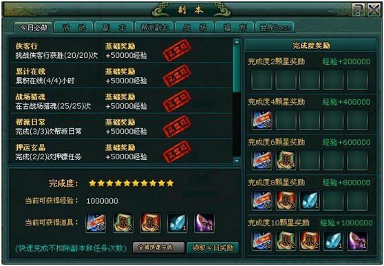 活动界面介绍 活动界面分别为活动一览与今日活动 首先点击“活动”能看到活动一览,活动都有时间段,基本都有经验加成奖励,很丰富 然后点击“活”字,进入今日活动界面查看 全部完成后就是10星,然后就可以领取奖励了
