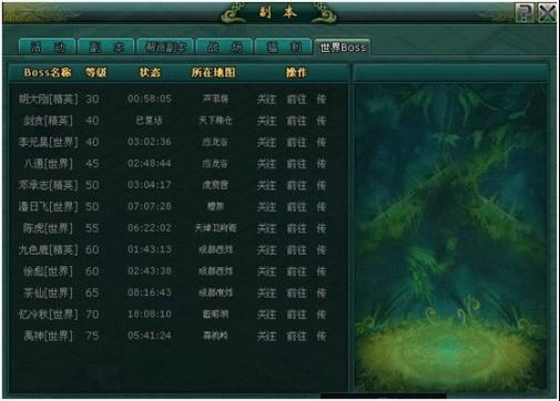 世界BOSS界面具体说明了BOSS名称、等级、复活时间、所在地图等