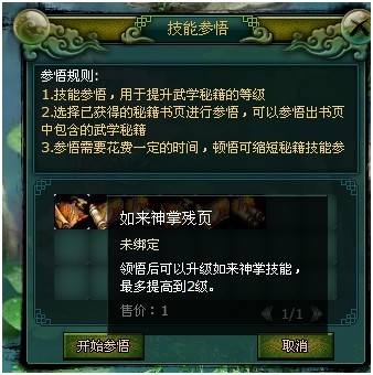 选择用于参悟的秘籍残页,通过参悟秘籍残页,获得残页中包含的武学结果。
