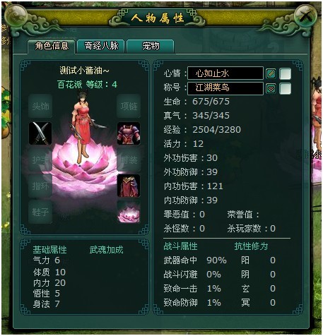 苍穹破角色的属性 角色的属性和称号的作用 通过点击游戏右下方的“人物”按钮,即可打开人物界面。人物界面包括“角色信息”、“奇经八脉”以及“宠物”三项。