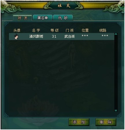 黑名单系统:和添加好友一样,点击“添加”按钮在提示框内输入需要加入黑名单的角色名后,该玩家就被加入黑名单了,加入黑名单的玩家对您进行私聊等操作系统将会提示您不在线或查无此人。