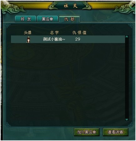 仇敌系统:当在游戏中被其他玩家击杀后,在仇人列表中会显示击杀您玩家的角色名以及仇恨值。