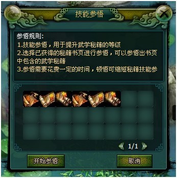 1.技能参悟,用于提升武学秘籍的等级