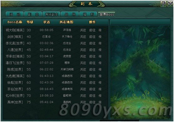 世界BOSS界面具体说明了BOSS名称、等级、复活时间、所在地图等