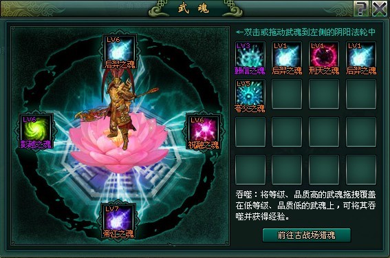 将等级、品质高的武魂拖曳覆盖在低等级、低品质的武魂上,可将其吞噬并获取经验。