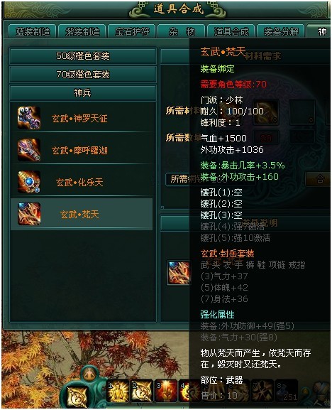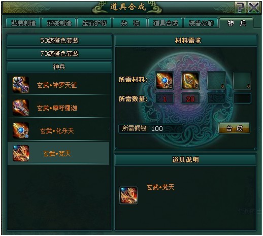 在“神兵”界面里,左边显示为50、70橙色套装制作以及神兵制作,右上方显示为需求材料以其所需铜钱,右下方显示为道具说明。
