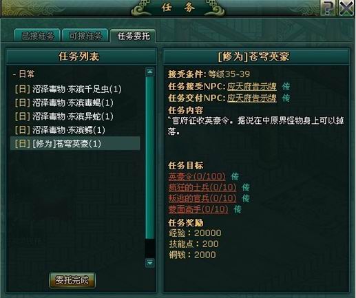 任务界面分为已接任务和可接任务还有日常任务,其中日常任务是可以直接使用元宝来委托,如下图可见,任务的详细情况非常直观的展现给大家,包括任务经验和奖励等,点击任务中显示的带下划线的目标,可自动寻路来完成任务,也可点击【传送】按钮,更快速的到达目的地噢