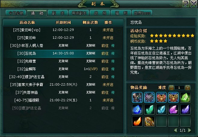 副本每天的14:30—15:00开放,在活动界面里可以查看前往,还有活动介绍和副本掉落